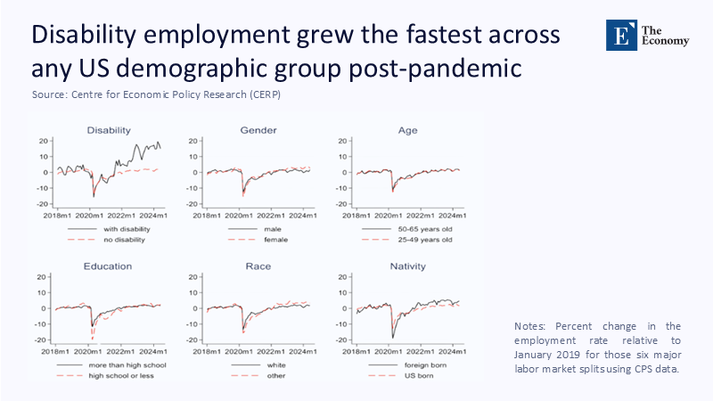 No group illustrates the shift more vividly than adults with disabilities. Bureau of Labor Statistics data show an employment-population ratio of 22.7% in 2024, up from 19% just before the pandemic. Translating the rate into head-count implies roughly 1.1 million extra disabled workers now drawing paycheques. The gain is broad-based, spanning education, race, and age splits, and has not reversed even as the broader unemployment rate ticked up in late 2024.