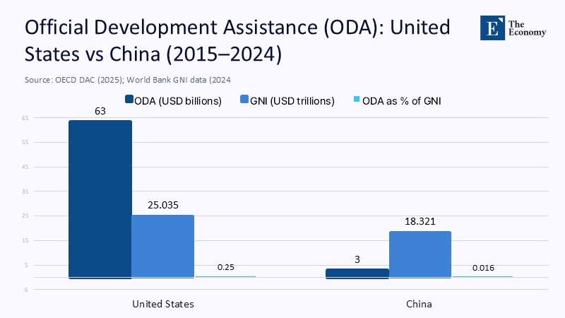 Yet absolute spending tells only part of the story. As Figure 2 demonstrates, America’s generosity translates into a far higher sacrifice of national income: US ODA equaled 0.25 % of Gross National Income in 2024, compared with China’s meager 0.016%. That tenfold multiple underscores that US aid is not merely larger in the aggregate but reflects a domestic willingness to budget real sacrifices for global public goods. Trump’s cuts would collapse that ratio toward Chinese levels, signaling a retreat in both leadership and commitment.