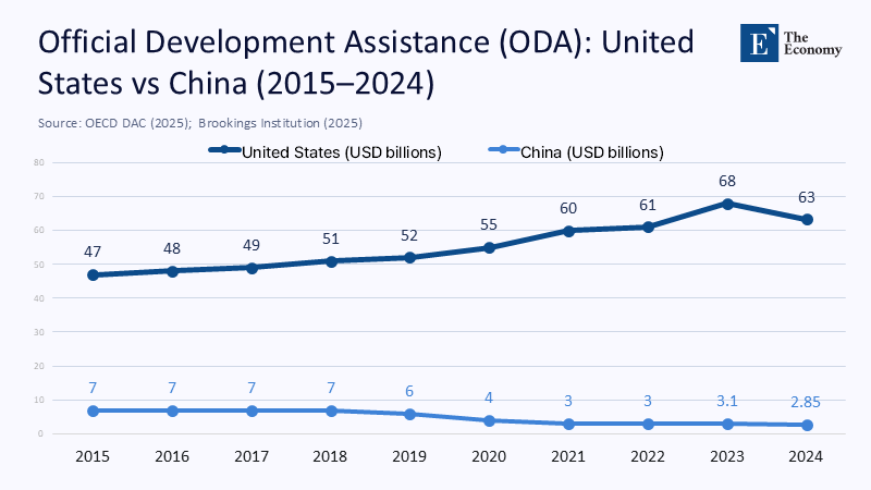 The scale of this reversal crystallizes when plotted against the last decade’s trends. Even amid the global aid contraction prompted by COVID-19, the United States led all DAC members in 2024 with US$ $63.3 billion in official development assistance (ODA), accounting for nearly one-third of the collective total. By contrast, China’s comparable outlays peaked near US$ $7 billion between 2015 and 2018, then plunged to US$ $2.85 billion by 2024, according to Brookings’ analysis of MOFCOM and CIDCA budgets. Under the administration’s proposal, America’s ODA would slip below levels China maintained through its austerity, effectively erasing the gap illustrated in Figure 1.