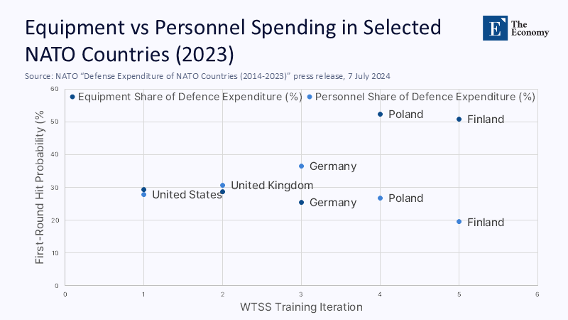 NATO’s budget breakdowns illuminate how allies value hardware relative to people. In 2023, member states’ average defence expenditure allocation was roughly 32% for equipment and 50% for personnel, with the remainder on operations and infrastructure. However, this average masks stark differences. As shown in Figure 1, Poland and Finland dedicate more than 50% of their defence budgets to equipment—52.4% and 50.8%, respectively—while spending just 26.7% and 19.5% on personnel. By contrast, Germany emphasizes human capital, allocating 36.6% of its budget to personnel—the highest among the surveyed nations—while investing only 25.4% in equipment. The United States and United Kingdom show more balanced spending, with approximately 30% directed to each category.