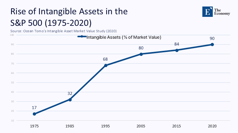 The popular barbs about “fake wealth” usually focus on influencers posing beside rented Lamborghinis. That trivialises the problem. The more consequential version of pseudo-wealth stems from firms and households recording tomorrow’s upside as today’s capacity to borrow. The shift from tangible to intangible assets is not just an accounting curiosity; it's a structural transformation that significantly magnifies expectation risk. When 90% of the S&P 500’s market value sits in brands, data sets, and code rather than plant and machinery, almost every valuation hinges on forecasts. Ocean Tomo’s longitudinal study tracks the inversion precisely: intangibles rose from 17% of the index value in 1975 to 90% by 2020, flipping the tangible-intangible ratio in just two generations.