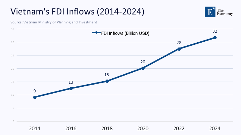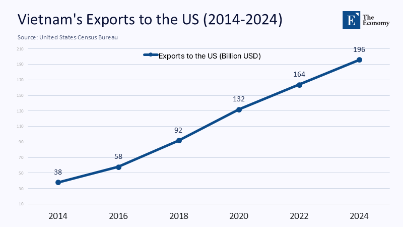 No emerging economy has compressed an industrial learning curve as aggressively as Vietnam. In 2014, the country shipped just $38 billion worth of merchandise to the United States; by 2024, that figure had vaulted to $196 billion—an 18% compound annual growth rate, three times the pace of China’s sales to America over the same period. Foreign direct investment provided the fuel: cumulative approvals crossed the half‑trillion‑dollar threshold last December, with two‑thirds flowing into processing and manufacturing. Samsung now assembles four‑fifths of its smartphones in Vietnam, Nike sources more shoes there than in China, and Apple’s supply chain has quietly commissioned ten new test‑production lines around Hanoi. The attraction has been straightforward: wages one‑third of those in the Pearl River Delta and preferential tariff treatment under the US Generalized System of Preferences. A growth spurt lifted Vietnam’s GDP by an average of 6.2% yearly through the pandemic. However, it also means Vietnamese prosperity is unusually influenced by external decisions made in Washington and Shenzhen rather than Hanoi.