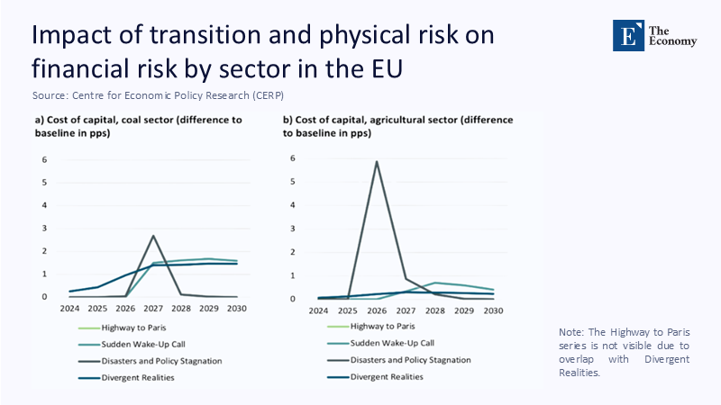 Further, CEPR’s sectoral analysis delineates cost of capital fluctuations across industries. In extreme climate scenarios, the coal sector’s cost of capital could spike by over 2.5 percentage points, reflecting heightened transition and policy risks. Similarly, the agricultural industry might experience capital-cost increases of up to 6 percentage points during peak disaster periods.