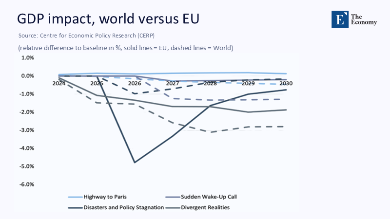 Model outputs also reveal stark GDP impacts. Under a “Disasters and Policy Stagnation” scenario—characterized by minimal climate policy intervention—East Asia’s aggregate GDP could contract up to 4% relative to baseline projections by 2027.