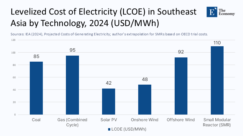 Figure 2 underscores the financial hurdle: SMR LCOE in Southeast Asia is projected at US $110 MWh—more than double the cost of solar and 40% above onshore Wind. Unless overnight capital costs can be compressed below US $4 000 kW⁻¹—a target even Idaho National Laboratory concedes is "aspirational"—the nuclear debate risks absorbing institutional bandwidth just when rapid-build renewables and grid-scale batteries could be deployed at scale for half the price.