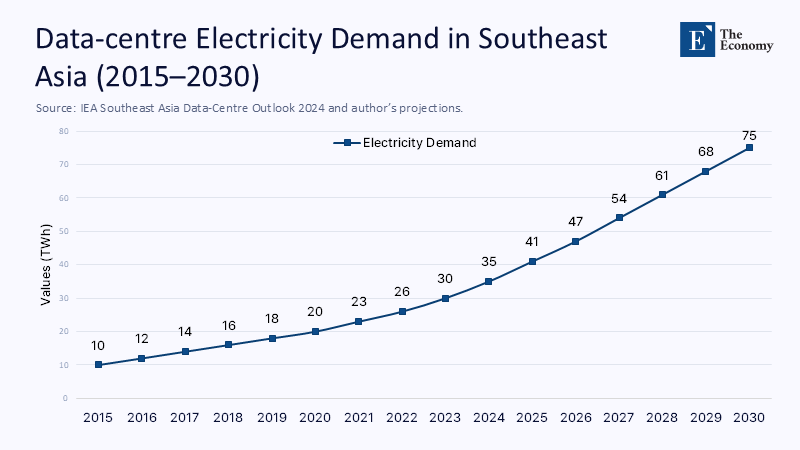 Three degrees of annual temperature rise might feel like a meteorological footnote in the equatorial tropics, yet those extra degrees are rewriting Southeast Asia's growth formula. They lengthen air-conditioner duty cycles, bend electricity load curves upward, and—crucially—expose the region's chronic dependence on imported fossil power. International Energy Agency (IEA) modelling shows that ASEAN electricity demand will leap from today's 1,300 TWh to more than 2,000 TWh by 2035, at a compound pace faster than every bloc except India. The risk is not that these "young" economies lack the means to go green, but that youthful infrastructure will be shackled to ageing carbon assets before renewables scale. Sunlight that scorches rooftops 250 days a year and monsoon winds that tear across the Mekong basin are latent advantages worth trillions in avoided fuel imports. Whether those advantages become bankable depends less on physics than how policymakers choreograph a scramble for data-centre electrons, electric-vehicle (EV) gigafactories, and dispatchable back-up capacity.