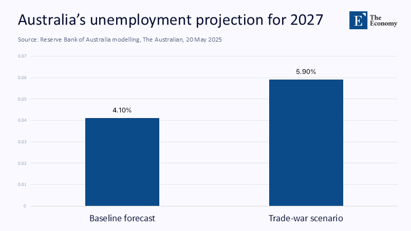 Reserve Bank modelling treats that proposal not as a bluff but as a baseline. Under the Bank's "trade-war" scenario, GDP growth slows by 0.7 percentage points, pushing unemployment from 4.1% to 5.9% by 2027 and erasing half the employment gains since the pandemic. The macro story converges with the micro: for every A $100 paid at a supermarket checkout, households would effectively transfer an extra A $1.60 to the federal government in lost real income by 2028—precisely the year the submarine program's domestic manufacturing ramp-up is due to peak.