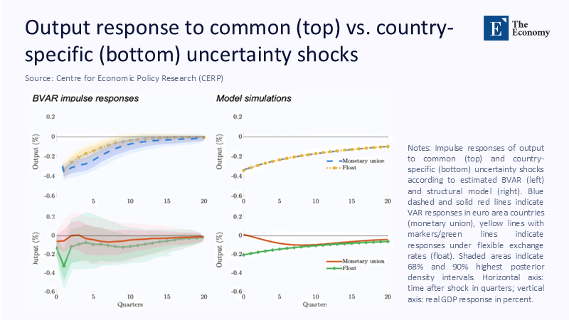 Quantitatively, the insurance premium embodied in that arrangement is significant. A recent Bayesian Vector Autoregression (VAR) analysis by Born, Huxel, Müller, and Pfeifer—drawing on quarterly data for thirty advanced economies between 1999 and 2023—finds that a one‑standard‑deviation country‑specific uncertainty shock slices roughly 0.4 percentage points less off real GDP in a euro‑area member than it would under a floating exchange‑rate regime of comparable depth. In their counterfactual simulations, the same shock depresses private investment by 1.2% under a float but only 0.4% within the union—a two‑thirds cushioning effect that compounds over time.