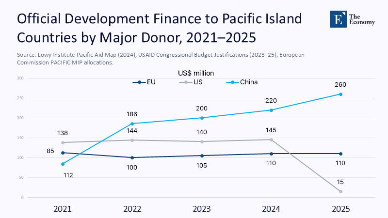 The ledger tells the story better than a diplomatic note ever could. China's disbursements to the Pacific rocketed from roughly US $85 million in 2021 to about US $260 million in 2025. European flows hover at a flat US $100–110 million annually. Once the region's bedrock, American commitments are projected to plunge below US $15 million—the price of resurfacing a single German autobahn junction—before the fiscal year closes. On a per-capita basis, Europe now spends roughly €110 per Pacific Islander over a four-year cycle; China spends about €730. Money is not everything, but symbolism counts, and no finance minister in Suva, Apia, or Port Vila can fail to see which partner writes bigger cheques with fewer caveats.
