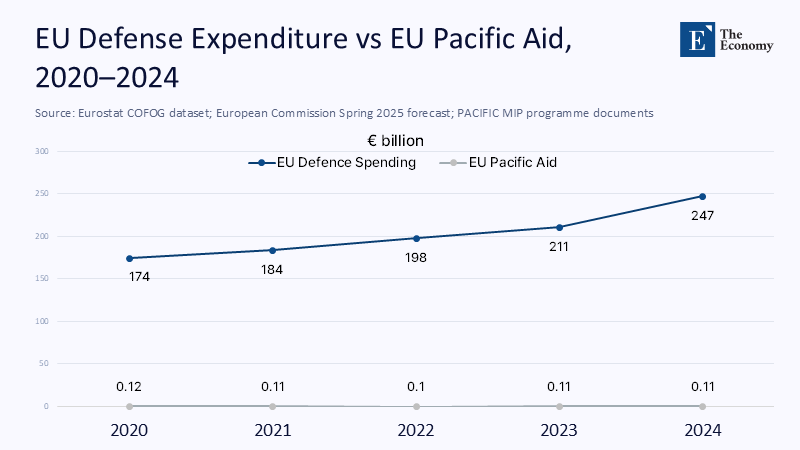 Little more than a decade ago, Brussels could indulge the illusion that its development purse was bottomless. Europhile planners spoke of a marge d'action extérieure, a discretionary bankroll that painted classrooms in Funafuti one quarter and funded judicial reform in the Sahel the next. That cushion collapsed the day Russia's tanks drove energy prices through the roof and forced every European treasury to divert windfall revenue toward artillery lines, LNG terminals, and refugee reception centers. Defense outlays that hovered near 1.2% of EU GDP in 2020 are on course to clear 1.6% by 2026—a rise that drains roughly €16 billion from civilian programs for every tenth of a percentage point added. In raw numbers, once booked for micro-grids in Kiribati or teacher training in Vanuatu, that money now buys 155 mm shells in Slovakia and Patriot interceptors in Poland. Pacific chancelleries read the budget annexes as clearly as anyone: what Brussels can still spare after plugging holes in its neighborhood is barely the loose change rattling in parliamentary coat pockets.