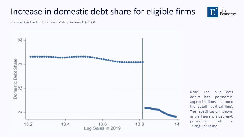Figure 2 shows the micro proof: a sharp discontinuity in the domestic debt share precisely at the eligibility cutoff. Firms within the size threshold raised their local currency share by about ten percentage points; those outside could not. The vertical cliff in the scatter is the market’s verdict on sovereign Solvency.