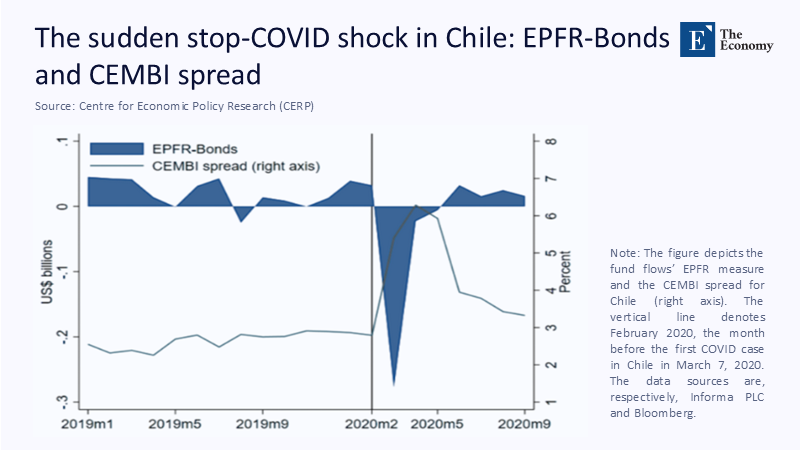 Credibility carries a price tag that only solvent treasuries can pay, and Figure 1 shows the invoice arriving in real time: as soon as Covid-19 reached Chile, bond-fund inflows swung negative by roughly 0.3 % of GDP, and the CEMBI spread on corporate debt exploded from 3% to 7%. That four-point detonation is not an abstract risk metric—it is the difference between a working-capital line rolling at single digits and the same firm staring at a doubled interest bill overnight. In the Heckscher–Ohlin logic, capital scarcity always sends the rental rate sky-high; the chart makes plain that the sovereign’s credit premium determines just how high and fast.