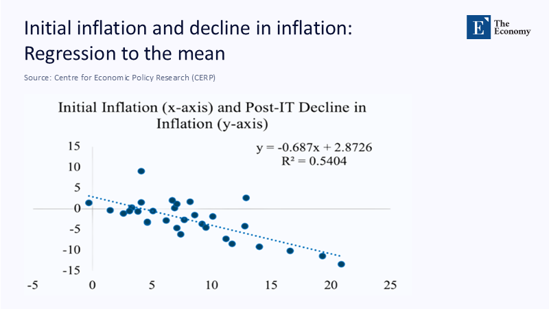Yet Figure 2 complicates the triumphalist take. The downward-sloping scatter, with a slope of –0.69 and an R² of 0.54, tells us that fully half the observed disinflation can be predicted by a mechanical regression-to-mean effect: the hotter a country was running at baseline, the faster inflation was bound to cool, targets or not. An honest analyst must, therefore, concede that part of what looked like policy magic was statistical gravity.