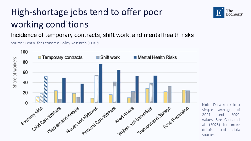 Readers can see in Figure 2 that shortages cluster in occupations—personal care, waiting tables, transport—where temporary contracts and mental-health hazards run two to five times the economy-wide average. Italy's labor inspectors report that 62 % of new hires in hospitality last year were on contracts shorter than six months; in Korea, half of all twenty-somethings employed in retail have no social insurance coverage. France's shift-work incidence tops 50 % among personal-care workers, and Japan's care-home staff face the region's highest recorded levels of workplace pressure, a discrepancy that fuels chronic vacancies even in a country famed for its work ethic. When graduates examine such conditions, they update their cost-benefit calculus swiftly, often by waiting out the market at home.