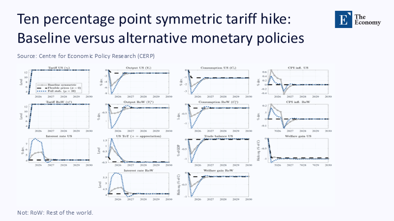 Under aggressive stabilization, the Fed drives policy rates above 7% within months, crushing demand quickly enough to cap the CPI spike near zero. Yet, the reward is paltry: output and consumption remain almost as low as in the baseline, and welfare, measured by Hicks-equivalent variation, barely budges. With perfectly flexible prices, inflation never lifts off, but the real economy contracts even harder because nominal wages cannot stick above equilibrium. The message is stark: monetary finesse can redistribute pain across sectors and calendar quarters, but it cannot conjure missing circuit boards, gearboxes, or API vials back into American warehouses. At best, the Fed can buy corporate treasurers a little time to reroute orders; it cannot rewind the tariff clock.