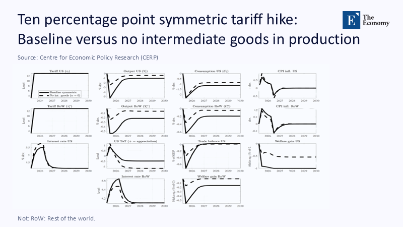 Auray, Devereux, and Eyquem’s dynamic model for CEPR was calibrated around a modest ten-percentage-point tariff hike. Yet, even that jolt sliced almost 3% off U.S. output on impact and hoisted consumer-price inflation by a third of a percentage point. Crucially, the output loss nearly halved when the authors stripped imported intermediates from the production function—essentially, imagining factories that rely only on labor. The result, reproduced in Figure 1 below, exposes global supply chains as both the transmission belt and the shock absorber of tariff pain.