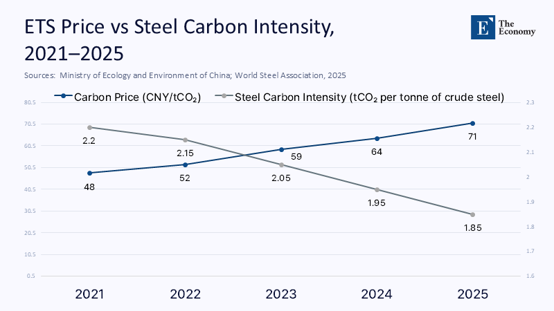 The juxtaposition of Figure 2’s two lines reveals an overlooked truth: a modest 48 → 71 CNY/t rise in allowance prices—barely $3.50 of incremental cost embedded in each tonne of steel—coexists with a steeper 2.2 → 1.85 tCO₂/t fall in carbon intensity. Market pressure explains only a sliver of that delta; state-directed investment and capacity cuts do the heavy lifting, leaving the ETS to validate gains ex-post. This validation role of the ETS should instill confidence in its effectiveness in driving emissions reductions.