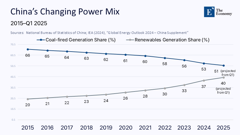 China’s National Bureau of Statistics reported that thermal generation—overwhelmingly coal-fired—shrank by 4.1% between January and April 2025, while total electricity demand eked out a 0.9% rise. That is not a blip: April marked the seventh consecutive month coal’s share fell year-on-year. Human geography explains why. Once synonymous with heavy coke, the northeast rust belt is losing aluminum output to hydro-rich Sichuan. At the same time, Shanxi’s new gigawatt-scale data centers link directly to adjacent solar farms, bypassing the coal grid. Simultaneously, provinces on the eastern seaboard—Guangdong, Zhejiang, and Fujian—are buying record volumes of “green certificates” to brand exports carbon-aligned with EU CBAM rules, further cannibalizing coal dispatch.