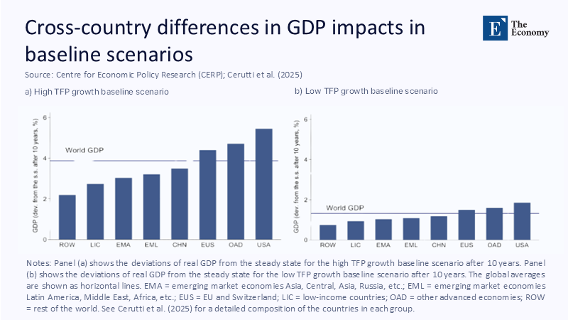 The intuition shows up visually in Figure 1. Under a high-TFP baseline—essentially, the scenario in which AI diffuses quickly through frontier economies—deviations from steady-state output after ten years climb above 5% in the United States and cluster close to 4–4.5% across the European Union and other advanced democracies. By contrast, low-income countries barely touch 3%, even under the optimistic setup in which AI is assumed to spill across borders at historic ICT diffusion rates. In the alternative, low-TFP scenario, the whole histogram sinks, but the ranking barely shifts. That stability underscores the column’s thesis: technology shocks magnify institutional differences rather than wash them away.