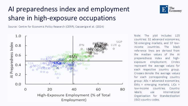 That compounding is visible in Figure 2. The scatter uses 125 countries to plot an AI-preparedness index on the vertical axis against the share of employment in high-exposure occupations on the horizontal axis. Advanced economies (the red cloud) bunch in the upper-right quadrant: they employ a larger share of workers in tasks amenable to machine learning and score highest on the institutional and infrastructural metrics that determine readiness. Emerging markets cluster mid-plot; low-income economies slump in the lower left, doubly disadvantaged by limited exposure and fragile preparedness. What looks like a static snapshot is, in reality, a predictive map: the further up and to the right a country sits today, the bigger its Solow residual tomorrow, indicating that current AI readiness can predict future economic growth.