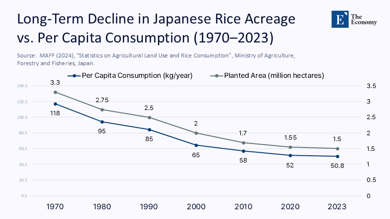 Japan's acreage-reduction scheme, or gentan, began in 1970 as a pragmatic response to surplus stocks. Over the past half a century, the program has contracted paddy land from 3.3 million hectares to 1.5 million hectares, even as per-capita consumption fell by a far more modest 57%. In absolute terms, the country now plants roughly 7.3 million tonnes less rice per year than it would under 1970 acreage — more than its entire table-rice appetite of 6.6 million tonnes. Against that backdrop, the 2024 heatwave merely exposed a structural supply gap that has been growing quietly for decades. The long-term consequences of these policies are dire, and sustainable solutions are urgently needed. Figure 1 here (Dual-axis line chart: acreage vs. consumption, 1970-2023) places that contraction against the slower drift in demand, illustrating how the margin for error has narrowed to a climatic hair's breadth.