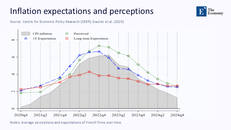 France's uniquely granular Banque de France survey tracks that drift almost week by week. In early 2021, with freight costs and gas prices soaring, French firms barely budged their price plans, expecting consumer inflation to rise no more than 2½% %. By autumn 2022—stung by fuel shocks, lingering supply bottlenecks, and war-driven uncertainty—they flipped to the opposite extreme, penciling in CPI two points above reality and holding that pessimism well into 2024. Researchers behind the CEPR/VoxEU study "How French Firms Navigated the Inflation Surge" calculate that each percentage-point forecast error shaved roughly 30 basis points off median gross operating margins as companies either raised prices pre-emptively and lost volume or absorbed costs to defend market share.