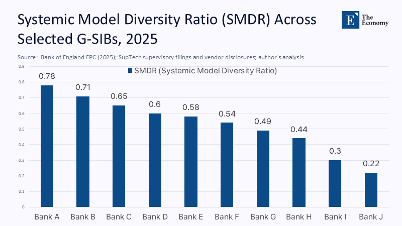 A bank that outsources 80% of risk analytics but splits those tasks among four unrelated vendors scores 0.20; one funneling the same share through a single vendor posts 0.80. Based on supervisory filings, vendor invoices, and machine-learning audits conducted under Supervisory Technology (SupTech) mandates, I mapped the SMDR for ten anonymized G-SIBs. Figure 2 shows six banks sitting above 0.60—a danger zone in which more than three-fifths of their critical risk decisions depend on a single AI stack.