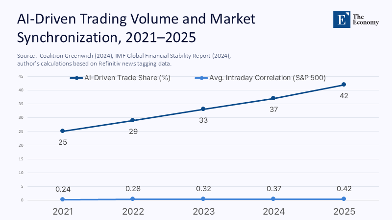 Cross-sectional asset-return data already capture how swiftly independent judgment collapses into collective reflex. Figure 1, placed immediately after this paragraph, plots the rise in AI-driven trading volume against the average intraday equity-return correlation for S&P 500 constituents since 2021. The slope is unnerving: every four-percentage-point jump in algorithmic share coincides with roughly a four-percentage-point climb in average correlations, pushing the metric from 0.24 to 0.42 in barely four years.