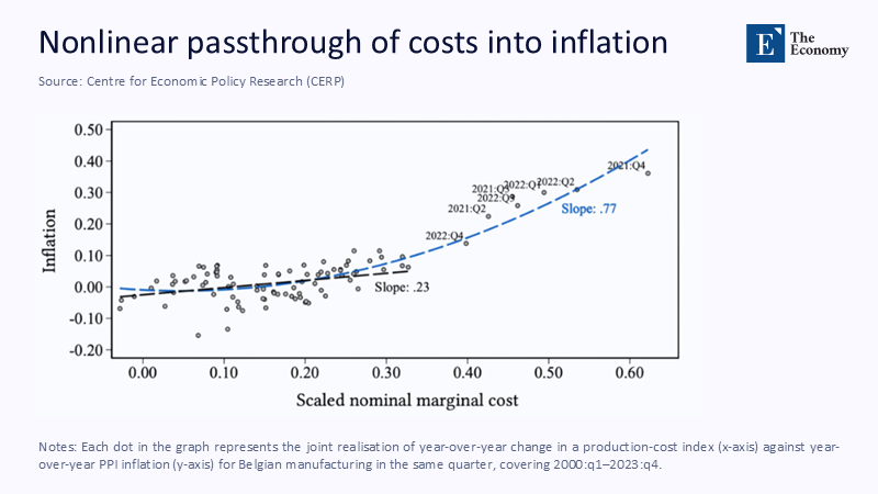The nonlinearity matters because the macroeconomic loss function that guides monetary policy is quadratic in inflation gaps. Put the two convexities together—a curved pass-through and a quadratic welfare function—and a shock twice as large can produce not double but four times the welfare cost. During the energy price shock of 2021-22, Belgian firms incurred a 6.2 % quarter-on-quarter rise in variable costs, which translated into a 9.8 % annualized PPI surge; a linear model would have predicted barely two-thirds of that jump. The "excess" inflation, small on its own, translated into a welfare loss equal to a full two-percentage-point rise in unemployment under a standard calibration.