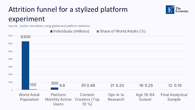 Consider a stylized anti-misinformation trial run on a platform with 300 million monthly active users to see how quickly representativeness implodes. Global data show that roughly 80% of those users live in upper-middle- or high-income economies, although only 44% of the world’s population does. That alone halves coverage for the rest of the globe. If 10% of users create 90% of posts, and opt-in rates to research follow a similar pattern, the adequate sample shrinks to about 30 million. Now, apply age-related consent gaps: among users over 65, only a quarter opt-in, compared with two-thirds of those under-30s, leaving roughly 12 million adults in the final analytical sample—just 0.19% of the global adult public. No amount of internal randomization can repair the hole that selection tears in external validity: power survives, and generalisability dies.