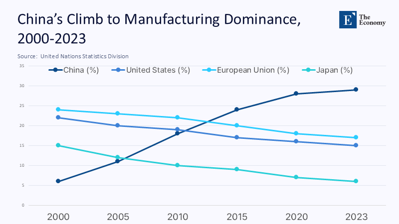 China now generates roughly 29% of global manufacturing value-added, more than the next four economies combined, according to United Nations data for 2023. That share stood below 6% at the turn of the millennium. Classic growth theory would attribute the leap mostly to factor accumulation, yet a closer look suggests exponential learning effects. Each doubling of output in China’s solar-PV sector between 2010 and 2023 delivered an average 28% decline in module cost—a textbook expression of Wright’s Law, which states that costs will fall by a consistent percentage for every cumulative doubling of units produced. This phenomenon is on a scale unmatched elsewhere. Cost curves are, therefore, compounding assets: every extra shipment lowers the marginal price of the next, setting off a self-reinforcing cycle that no import duty can neutralize once critical mass has been reached.