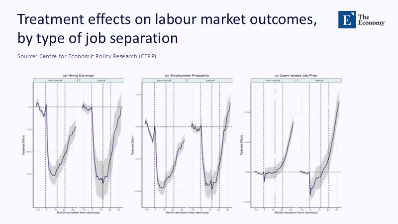 The graph illustrates a stark dualism: laid-off workers trace a deeper canyon and a more prolonged climb-out. Their earnings bottom at –18% around month 12 and only brush zero after month 32; non-layoff exits, by contrast, begin to heal after year one. Policymakers who imagined that lower firing costs would be neutral across separation types overlook how collective redundancies transmit a more toxic signal than negotiated exits—particularly in a labor culture already allergic to résumé gaps.