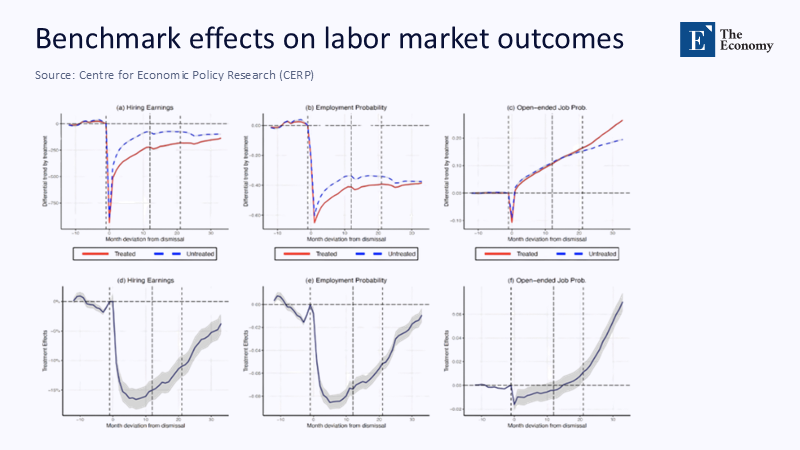 Administrative tax files add texture. For workers dismissed after 2015, median first-year earnings plunged 27%, and five years remain 11% below pre-layoff levels. A stacked-event study by CEPR attributes nearly four percentage points of that additional scarring to the Jobs Act, net of business-cycle effects.