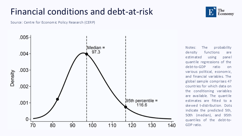 Debt-at-Risk (DaR)—a concept introduced in a significant 2025 IMF working paper—fills that void by modeling the entire conditional distribution of future debt. This paper, a culmination of extensive research and analysis, has been widely recognized for its innovative approach to understanding and predicting future debt scenarios. Borrowing the intuition of bank Value-at-Risk, the framework asks, 'Where will the debt-to-GDP ratio be in five years?' but also, 'With 5% probability, how high could it reach?' Using a location-scale panel quantile regression across 123 economies, the authors show that tightening financial conditions raises future debt's location (the expected path) and the scale (the dispersion). The result is a thickening right tail that standard deterministic models miss. A companion VoxEU column applies the method to today's macro-financial backdrop and finds that global three-year-ahead DaR already sits almost twenty percentage points of GDP above the median.