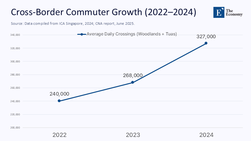 Traffic counts reveal immediate elasticity. Immigration and Checkpoints Authority data show Woodland's daily crossings leaping 22% to an average of 327,000 in 2024, with peaks above 376,000. If just 15% of those travelers are habitual wage earners, Singapore's effective labor pool swells by roughly 49,000—equivalent to the entire resident workforce of Pasir Ris. When the 4-km Rapid Transit System (RTS) enters service in 2026—77% complete as of April—the commute compresses to five minutes platform-to-platform.
