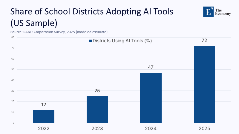 Teachers describe their craft as relational, yet an OECD time‑use audit of four high‑income systems shows that up to 40% of weekly hours in primary and lower‑secondary schools are consumed by preparation, grading, and clerical reporting. These activities look uncannily like the routinized motions of factory work—and the machines have arrived. RAND’s 2025 survey of U.S. district leaders reports a 25‑percentage‑point jump in districts that train staff to outsource such tasks to AI, doubling adoption in a year. The assembly‑line analogy is, therefore, more than a metaphor; it is a labor-process description. When a chatbot can mark 500 multiple‑choice quizzes before lunch, the economic rationale for employing a full‑time human marker collapses, just as the rationale for sewists collapsed when mechanical looms standardized stitches.
