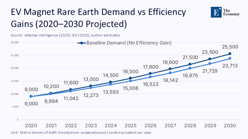 The International Energy Agency’s Global Critical Minerals Outlook 2025 shows that China still refines about 70 % of the world’s strategic minerals, including 96 % of rare earths, but also notes that non-Chinese mine output for rare-earth oxides quadrupled between 2015 and 2022. Pair that data with a simple calculation: every one-percent efficiency gain in neodymium-iron–boron magnet chemistry releases roughly 700 t of NdPr, enough for six gigawatts of offshore wind capacity—more than the entire annual addition of the United Kingdom. This efficiency gain represents the 'innovation dividend,' a significant productivity and resource utilization increase. Even a conservative three-percent gain trims the equivalent of Norway’s 2024 wind-power build-out from raw-material demand.