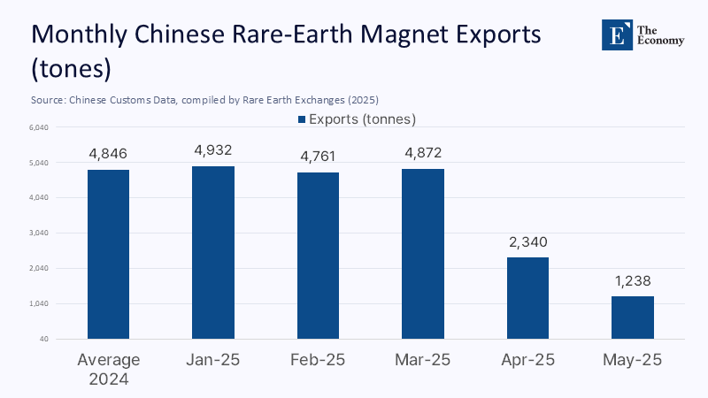 A "strategic" move that erodes its foundations: When Beijing imposed an export-license requirement on samarium, dysprosium, and finished NdFeB magnets on 4 April 2025, its planners hoped to jolt Washington into softening semiconductor restrictions. Yet within eight weeks, China's magnet shipments collapsed by 74% year-on-year, erasing roughly US $70 million in revenue for May alone, while US imports of Chinese magnets tanked 93% over the same span. The policy put the frailty of China's downstream firms on full display far more vividly than it unsettled American negotiators, and the episode illustrated a harsh truth: a commodity monopoly becomes a liability the moment it is brandished as a weapon because the threat itself galvanizes substitution, diversification, and political backlash.