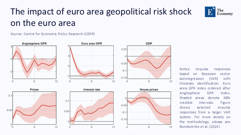 A Tehran–Tel Aviv exchange shifts oil-option skews in New York, but it changes real variables—energy import bills, balance-of-payments flows, and the politics of fiscal solidarity—within the European Union. This asymmetric shock, as we term it, is a key factor in understanding the impact of geopolitical events on different regions. Economies that import 87% of their primary energy, as the euro area still does, exhibit a demonstrably larger pass‑through from conflict headlines to forward inflation swaps than the United States, where net energy exports cushion terms‑of‑trade shocks. Vector-autoregression work at the European Central Bank shows that a one-standard-deviation EA-GPR shock subtracts 0.6 percentage points from euro-area GDP within eight quarters while adding 0.4 points to core HICP inflation, even after controlling for the Caldara–Iacoviello global index. Figure 2 below illustrates how euro-area-specific geopolitical shocks are transmitted through the real economy. GDP contracts steadily while inflation and interest rates rise, reinforcing the need for tailored policy responses that US-centric models overlook.