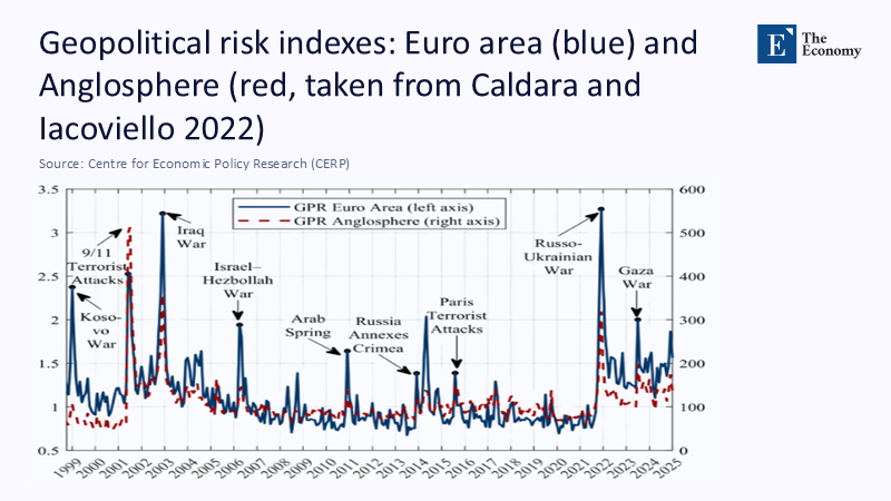 As shown in Figure 1 below, the euro-area geopolitical risk index surged nearly 40% during the start of the Ukraine war in 2022 and again spiked after the Gaza conflict of 2023. These jumps were far steeper and longer-lasting than those seen in the Anglosphere index, underscoring how regional proximity defines the shock’s intensity.
