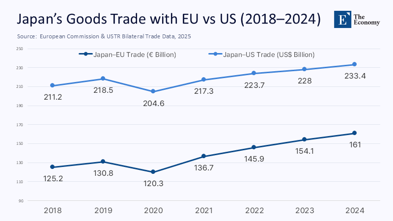 The numbers illuminate the qualitative story. EU exports of goods to Japan increased from €64 billion in 2023 to €68.8 billion in 2024, a 7.1% rise that extends a five-year upward trend. Total bilateral services trade surpassed €58 billion, representing a 34.7% increase since the EEPA's first anniversary. Meanwhile, US goods exports to Japan grew to US $79.7 billion in 2024, but that reflected price effects in aerospace and LNG rather than volume expansion; on a volume basis, growth has flat-lined since 2019. Japanese foreign direct investment in Europe now stands at €212.5 billion—triple the EU's investment stock in Japan—confirming that corporate Japan is embedding its supply chains more deeply into the single market, not merely selling finished goods there. The geometrical metaphor is instructive: Europe provides Tokyo with multiple nodes of interdependence, thereby diluting the capacity of any single partner to coerce.