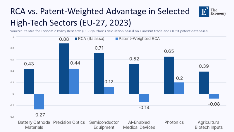 Fixing the mirror requires two analytical upgrades. First, patent-weighted RCA multiplies each product’s export share by the ratio of domestic to global patents in its underlying IPC classes. Applied to 2024 data, this hybrid flips Europe’s supposed edge in battery cathode materials from positive (0.43) to negative (-0.27) and halves its perceived advantage in precision optics.
