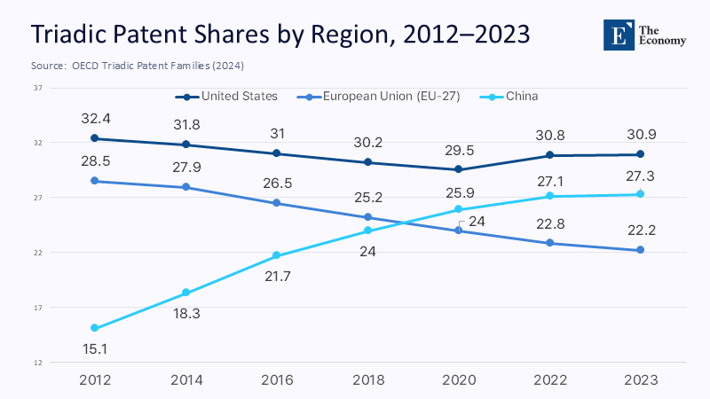 Turn from customs windows to patent offices, and the picture sharpens. OECD Triadic counts for 2023 place the EU-27 at 22% of world frontier inventions, the United States at 31%, and China at 27%.