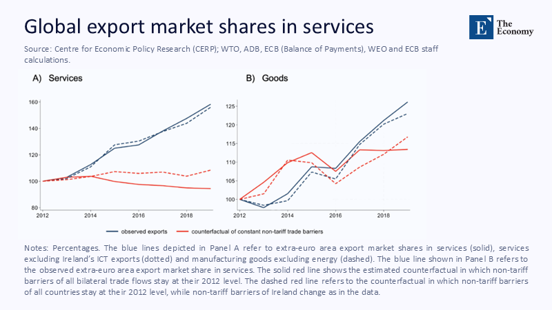 The numbers frame the paradox. The weighted average tariff faced by European merchandise entering the United States has surged to its highest level since the inter-war period, affecting everything from lithium batteries to breakfast cereals. And yet, over the same 2012-2024 period, euro-area exports of services delivered remotely — including software, management consulting, architectural design, and digital advertising — expanded from 30% to 48% of the bloc's external sales, outpacing global trade in similar categories. Internal modeling by European Central Bank staff shows the key driver: a drop in NTBs specific to services markets. When they hold those barriers constant at their 2012 level, exports would have barely changed; allowing them to fall yields a three-percentage-point gain in the euro area's global services share by 2019, a gain that has since widened.