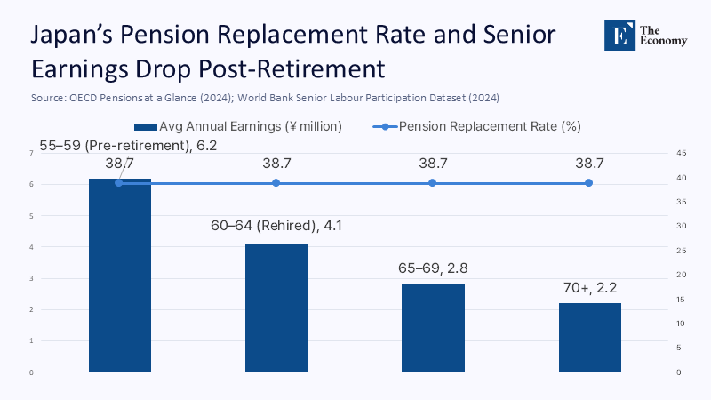 Japan’s seniority-based wage model remains the structural culprit. Corporate pay peaks in the mid-fifties and then drops sharply when employees are rehired as “contract workers” after the statutory retirement age of 60. The OECD’s 2024 Survey calculates that 70% of firms impose such mandatory exit gates, and post-retirement hourly earnings fall by an average 3of 0% for identical tasks. Reformers focus on abolishing the retirement rule, but the greater prize is decoupling pay from tenure altogether. A “two-band” wage schedule, piloted by a consortium of mid-sized manufacturers, starts band B at 90% of an employee’s last band-A wage, escalates annually with performance metrics identical to those applied to younger staff, and extends promotion opportunities indefinitely. Internal cost modeling reveals a mere 4-per-cent increase in lifetime payroll obligations but an 18-per-cent rise in average earnings after 60, which is enough to close half of the net replacement rate gap without new public transfers. Daikin’s 2024 sustainability report notes that eliminating the automatic retirement cliff for frontline technicians reduced churn and saved ¥3 billion in hiring costs—an implicit productivity dividend that dwarfs traditional seniority savings.