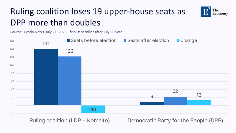 The summer’s narrative has been too tidy: a country allegedly souring on foreigners suddenly elevates a “Japanese First” party. The vote’s mechanics tell a more prosaic story. A minority government already weakened by a 2024 lower‑house setback, a significant loss in the previous lower-house election, stumbled again, shedding its upper‑house majority. Prime Minister Shigeru Ishiba faced sliding approval and internal dissent even before ballots were cast, with investors and party elders openly questioning his staying power. In that context, discontent sought a vessel. It found one in right‑populists who promised tax relief, bigger benefits, and a restoration of order, less a coherent ideology than a protest slate braided to cost‑of‑living stress. Importantly, the party’s seat gain still leaves it a small force, while voter issue salience clustered around household economics, not identity. Interpreting the outcome as an anti‑foreigner pivot ignores the election’s baseline facts: price anxiety was ascendant; trust in the ruling party was brittle; leadership looked tentative.