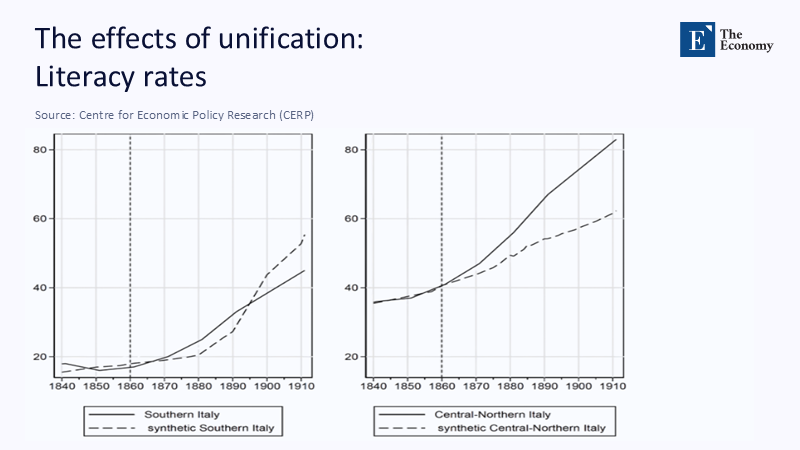 The North–South educational gap is not a new phenomenon. Data from the post-unification period reveal a striking divergence: even as national literacy rates climbed steadily, Southern Italy remained behind both its projected progress and the actual progress in the north. This underscores how geography has shaped the ability to absorb policy reforms, with southern institutions facing deeper structural obstacles that persist to the present day.