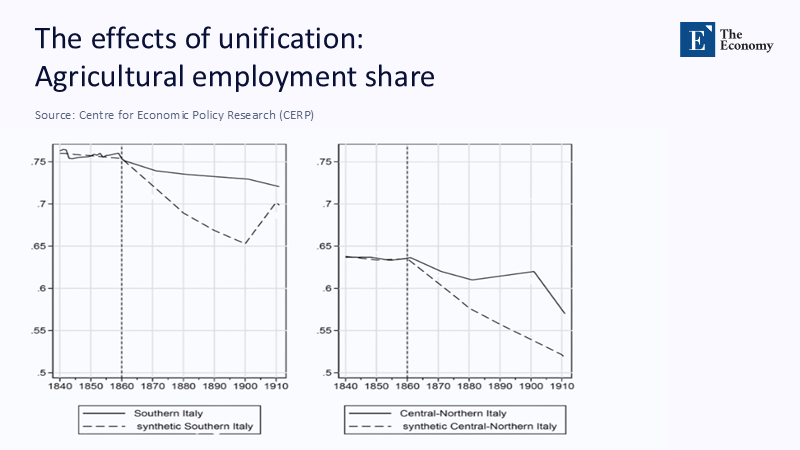 Historical labour trends help illuminate the origins of today’s economic divergence. In the wake of Italy’s unification, agricultural employment remained persistently high in the south, contrary to what synthetic regional models predicted under equal development conditions. While the North diversified into manufacturing, the South’s structural transition stalled, laying the groundwork for today’s uneven productivity map.
