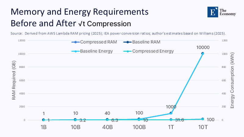 Most public discussions treat cloud costs as an opaque line item; unpacking the arithmetic clarifies what is now in play. AWS bills RAM at roughly $0.0000167 per GB-second. A ten-hour job that holds 20 TB of live Memory, therefore, accrues approximately $12,300. Compress the memory footprint by the square root, and the figure falls to $864, a fourteen-fold reduction. Electricity follows the same slope. Dimms account for nearly half the heat load in modern AI racks; each kilowatt spared at the memory layer typically saves another 0.8 kilowatts in cooling and power-delivery overhead. Across a 100-megawatt data center campus, widespread $\sqrt{t}$ adoption could free up enough grid capacity to power a mid-sized city.