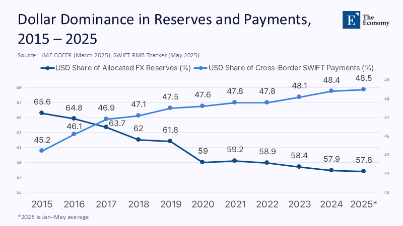 Sceptics will counter that a rising chorus—from BRICS summits to TikTok explainers—heralds an imminent dollar eclipse. The facts remain stubborn. The yuan’s share of global payments slipped to 2.89% in May 2025, its lowest in two years, while the dollar’s share held nearly 48%. Even a coordinated oil-for-yuan pilot between Russia and India ultimately settled through dollar-clearing correspondent banks, as counterparties preferred the legal certainty of New York jurisdiction. The Atlantic Council’s latest Dollar Dominance Monitor finds no evidence of a structural break since the imposition of sanctions on Russia in 2022; the lost dollar share in reserves has been scattered among “small currency” buckets, not captured by a single rival.